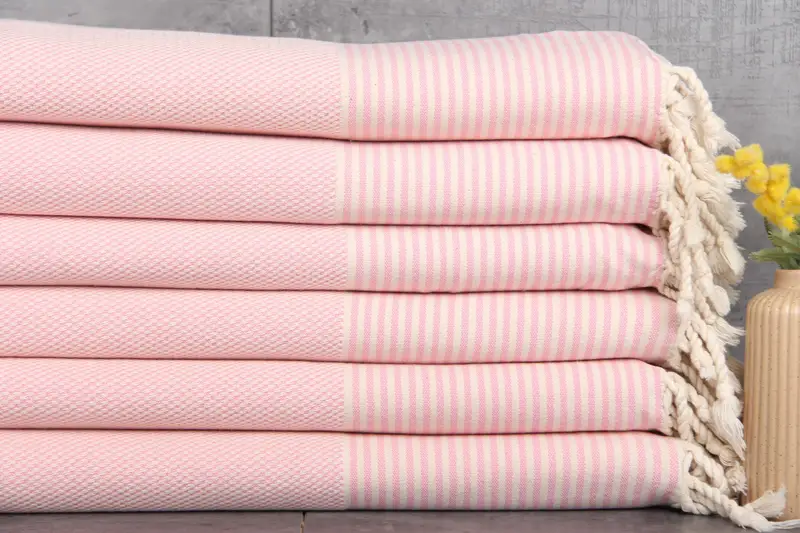 Organic cotton Turkish towels are characterized by their high absorbency, which improves with each wash. These towels, weighing 380 grams, maintain dimensions of 36x71 inches or 90x180 centimeters. The hand-weaving process allows for slight variations of 1-2.5 cm in dimensions.