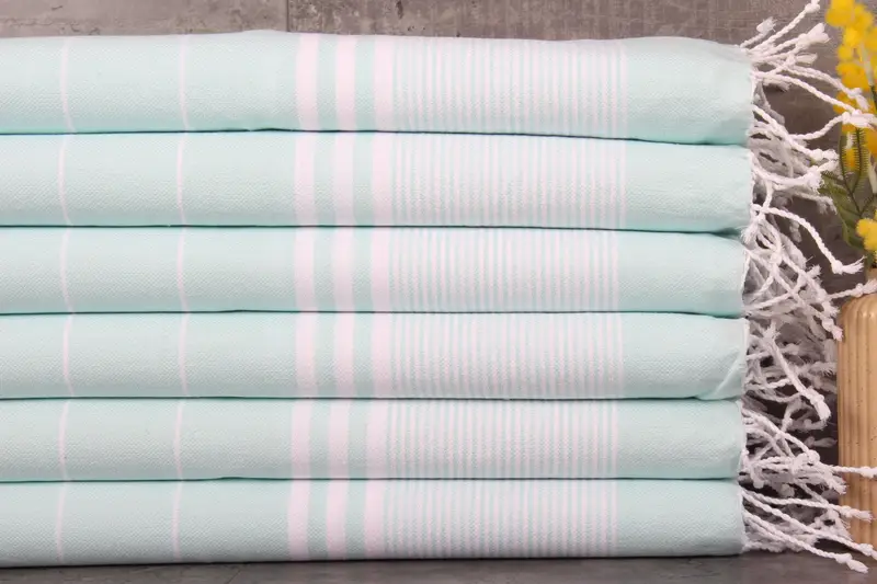Comprised predominantly of 100% organic Turkish cotton, these towels exhibit notable absorbency and softness, ensuring durability and comfort. Characterized by a size of 24x40 inches or 60x100 centimeters, they weigh approximately 120 grams, providing adequate thickness and substantial usage potential. Tolerances in hand-weaving may result in slight variations, measuring up to 1-2.5 cm.