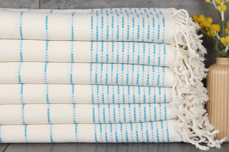 The Turkish towels are characterized by their fiber composition, primarily being made from 100% organic Turkish cotton, ensuring high absorbency and softness. Each piece is meticulously crafted, resulting in towels measuring 38x71 inches or 95x180 centimeters, with a weight of 420 grams. These towels exhibit hand-weaving tolerances of 1-2.5cm.