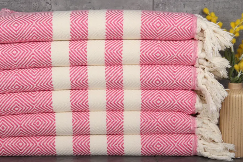 These bath towels are characterized by their 100% organic Turkish cotton composition, ensuring superior absorbency and softness. Each towel features a weight of 100 grams, with dimensions of 20x32 inches or 50x80 centimeters. Hand-weaving results in a tolerance of 1-2.5 cm in the dimensions.