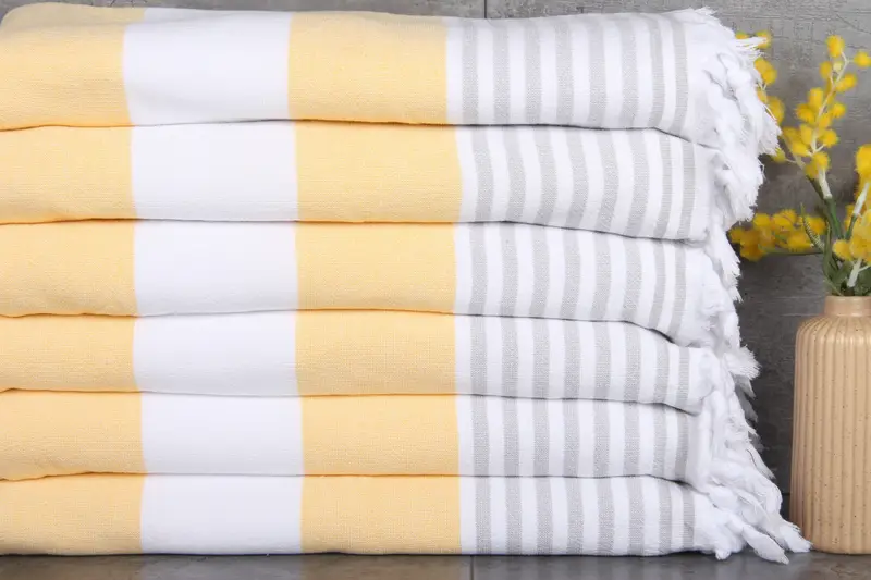 The towel features a sub-category of bath towels, marked by a combination of yellow and light gray stripes with a secondary beige color. Ensuring product longevity, it is advised to wash the towel separately during the first 2-...