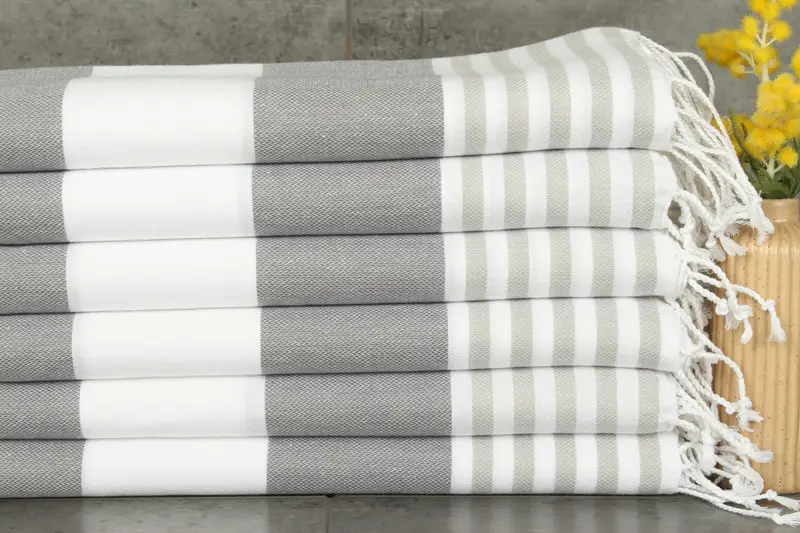The towels are composed of 100% organic Turkish cotton, ensuring high absorbency and softness. Each towel measures 24x40 inches or 60x100 centimeters, weighing 100 grams. The hand-weaving process allows for tolerances of 1-2.5 cm. The towels feature a sub-category specification, emphasizing their utility as bath towels.