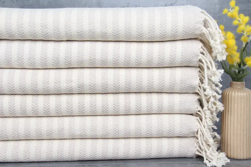 The towels are standardized at dimensions of 18x40 inches or 45x100 centimeters, with a weight of 115 grams per square meter, and slight hand-weaving tolerances of 1-2.5 cm.