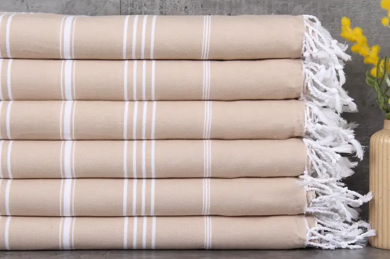 Ensured from 100% organic Turkish cotton, the Turkish beach towel is natural-dyed for durability and softness. Measuring 38x73 inches (95x185 cm), and with a weight of 280 grams, the towel is characterized by hand-woven construction that allows for minor variations of 1-2.5 cm in its dimensions. Customers can benefit from customization options such as embroidery and personalization, with pre-shrunk towels ready for immediate use.