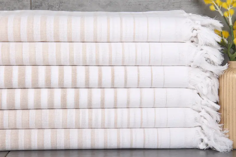 Characterized by a 100% organic Turkish cotton construction, the towels are noted for their superior absorbency and durability. Each towel weighs 240 grams, ensuring their substantial quality. They are sized at 40x69 inches or 100x175 centimeters, with hand-weaving tolerances between 1-2.5 cm, resulting in a high-quality, consistent product.