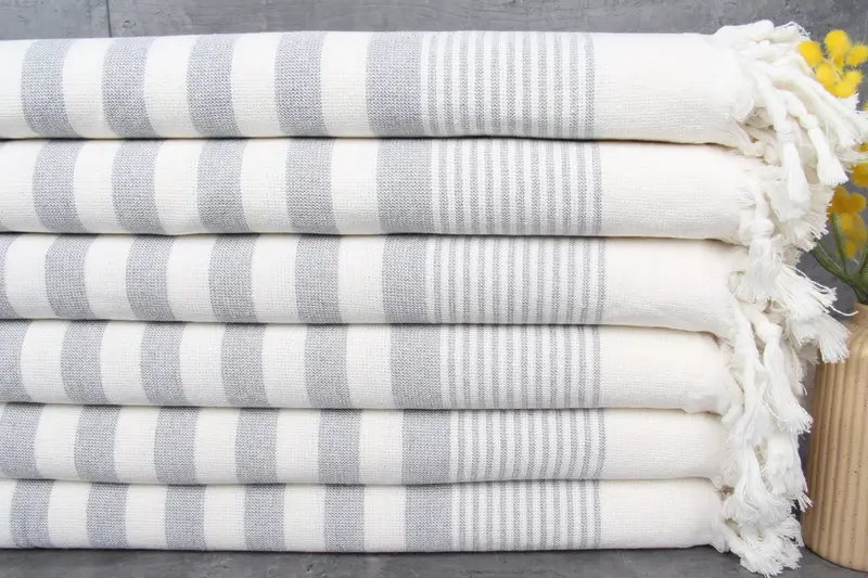 The Turkish Bath Towels are characterized by their construction from 100% organic Turkish cotton, ensuring a high-quality fiber composition and superior absorbency. Each towel is meticulously crafted with natural dyes, resulting in a diverse range of earthy and muted tones. Towel dimensions measure 36x67 inches, corresponding to 90x170 centimeters, with a weight of 420 grams per towel. Hand-weaving tolerances for the product are within 1-2.5cm, ensuring consistent quality across the product range.