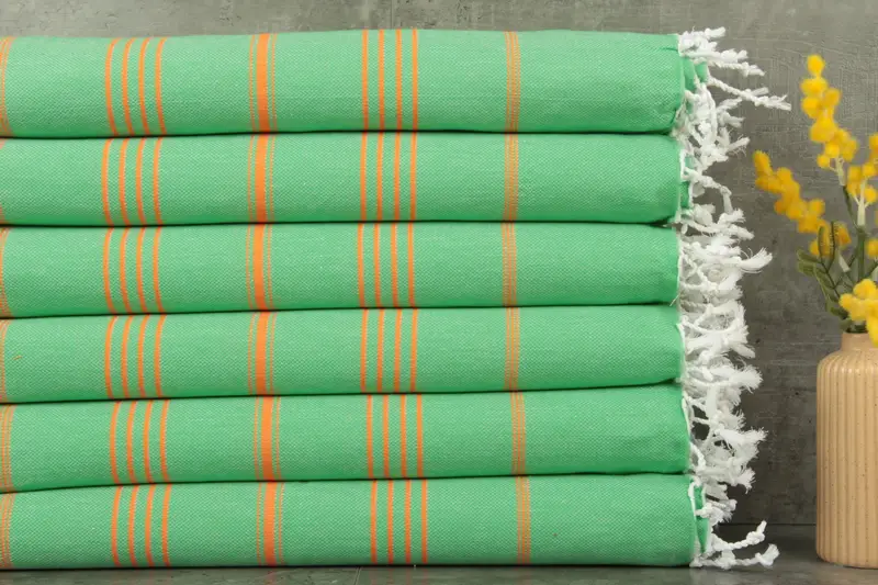 Our Turkish Beach Towels are characterized by their use of 100% organic Turkish cotton, ensuring superior absorbency and natural dye colors. These towels are sub-category bath towels, measuring 40x71 inches or 100x180 centimeters, weighing 265 grams. Each piece is hand-woven with a tolerance of 1-2.5 centimeters.