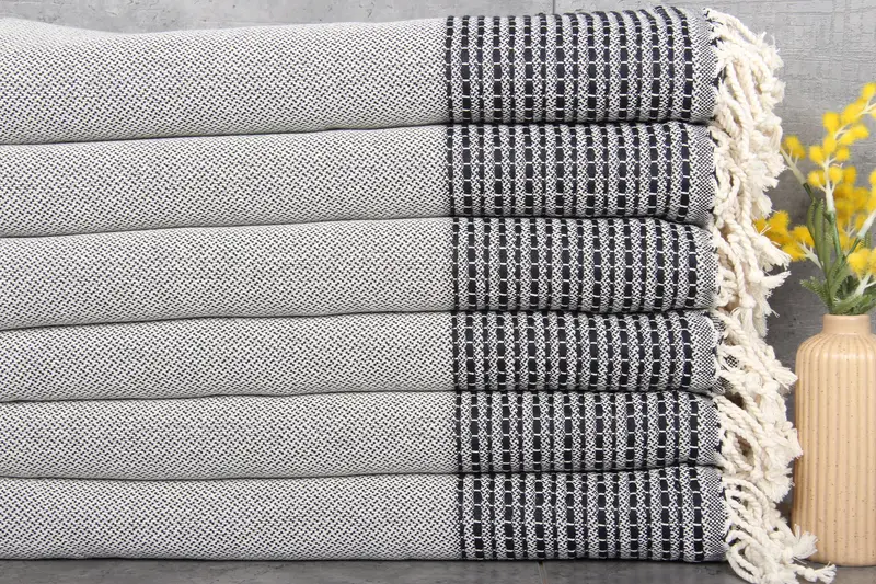 Our Turkish towels are characterized by their construction with 100% organic Turkish cotton, ensuring natural dye absorption and superior absorbency. Measuring 36x69 inches or 90x175 centimeters, these towels are handwoven, resulting in a weight of 420 grams. Variations in measurements, owing to hand-weaving tolerances, should be expected within 1-2.5 centimeters.