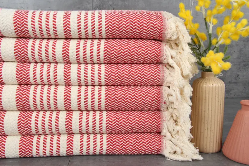 Characterized by pure organic cotton fibers, the towels are made from 100% organic Turkish cotton, ensuring a natural dye process. Resulting in high absorbency, each towel weighs 230 grams per square meter, with dimensions of 40x71 inches or 100x180 centimeters, with a hand-weaving tolerance of 1-2.5 centimeters.