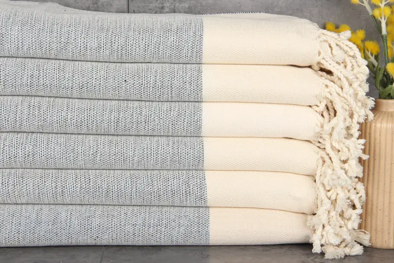 The Turkish towels and blankets are woven from 100% organic Turkish cotton, ensuring a natural and soft fiber composition. Resulting in high absorbency, these towels enhance their utility over time, with each wash increasing their water absorption capacity. Measuring 38x63 inches (95x160 centimeters) and weighing 380 grams, the towels come with a hand-weaving tolerance of 1-2.5 cm.