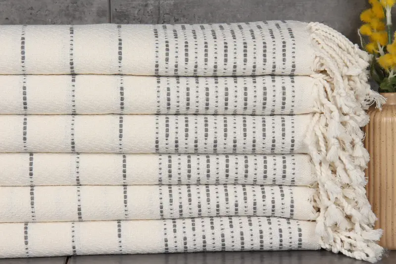 Turkish towels, characterized by their high absorbency and durability, are crafted from 100% organic Turkish cotton. This material ensures superior water absorption, resulting in towels that dry quickly and maintain softness after multiple washes. The towels have a weight of 420 grams and are available in a standard size of 38x71 inches (95x180 centimeters), with hand-weaving tolerances of 1-2.5cm.