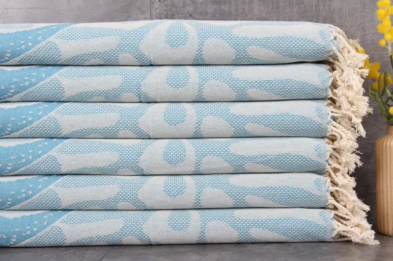 Turkish towels are characterized by their 100% organic Turkish cotton composition, ensuring high absorbency and durability. These towels are hand-woven with meticulous attention to detail, resulting in towels that are pre-shrunk and ready for use. Measuring 18x38 inches or 45x95 centimeters, they weigh 90 grams, with a tolerance of 1-2.5 centimeters due to the hand-weaving process.