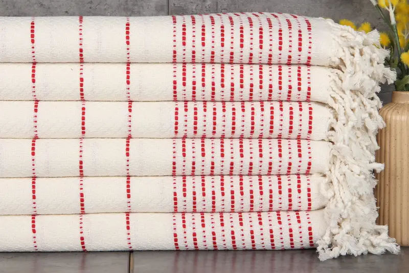 Featuring a blend of fibers, these Turkish towels are made from 100% organic Turkish cotton. Characterized by their superior absorbency, these towels achieve maximum water absorption with each wash, ensuring longevity and enhanced softness. Each towel weighs 420 grams, measuring 38x71 inches or 95x180 centimeters, with a tolerance of 1-2.5 cm due to hand-weaving.