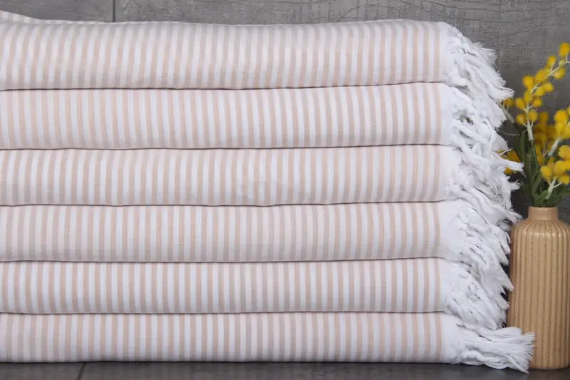 Characterized by their high-quality Turkish cotton, these towels exhibit exceptional absorbency and softness. Comprising 100% organic Turkish cotton, they are naturally dyed, ensuring vibrant colors that fade gently with each wash, resulting in an increasingly absorbent towel. Each piece weighs 200 grams and measures 36x67 inches or 90x170 centimeters, with hand-weaving tolerances of 1-2.5 centimeters.