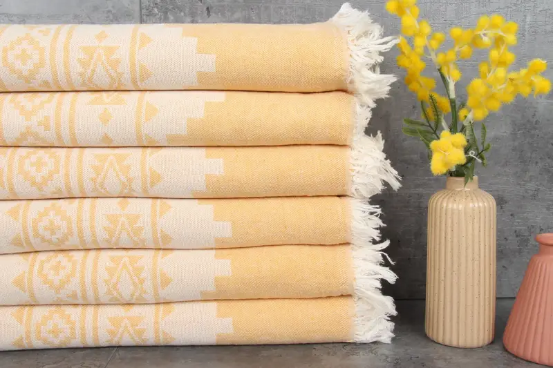 Turkish towels are characterized by their 100% organic cotton construction, ensuring natural dyeing and high absorbency. Each towel weighs 220 grams/square meter, with a standard dimension of 40x70 inches (100x180 centimeters). Hand-weaving tolerances are approximately 1-2.5 cm.