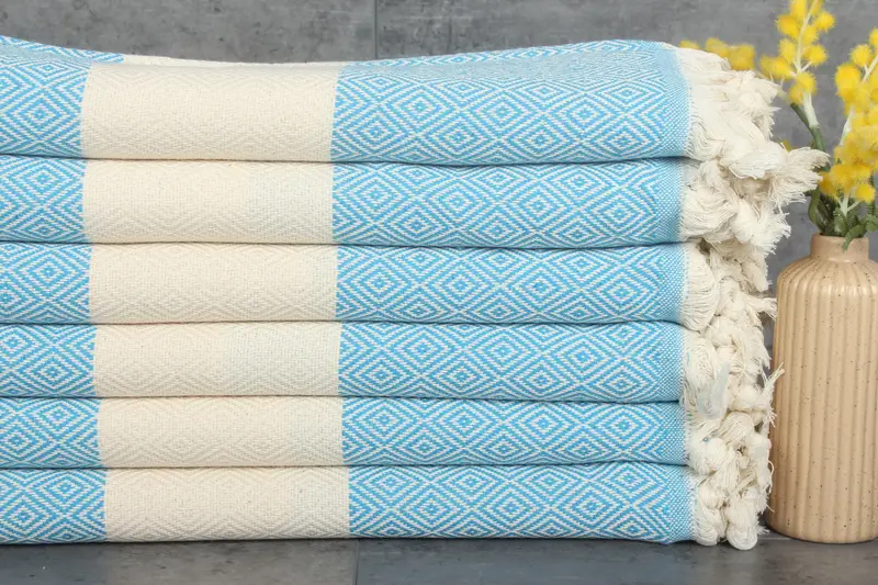 Turkish towels are characterized by their organic cotton composition and natural dyeing process, ensuring durability and hypoallergenic properties. Measuring 40x71 inches or 100x180 centimeters, these towels weigh 420 grams per square meter, resulting in a lightweight yet robust hand-woven product. Each towel exhibits slight tolerances of 1-2.5cm in dimensions due to its handmade nature.