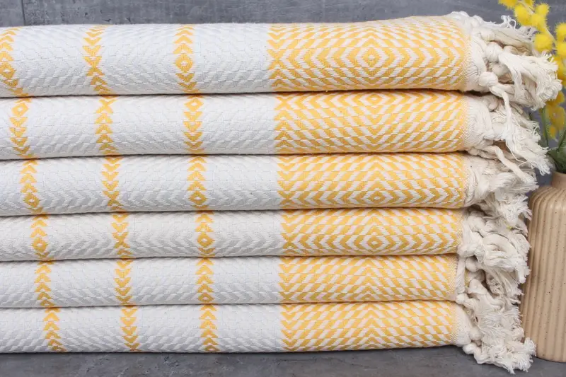 Characterized by %100 organic Turkish cotton, these towels are distinguished by their natural dyeing process, ensuring a hypoallergenic and eco-friendly fiber composition. Resulting in a weight of 460 grams, they maintain an optimal balance between absorbency and lightness. Dimensions of 40x79 inches or 100x200 centimeters allow for a versatile range of applications, while hand-weaving tolerances of 1-2.5 cm accommodate artisanal variations.