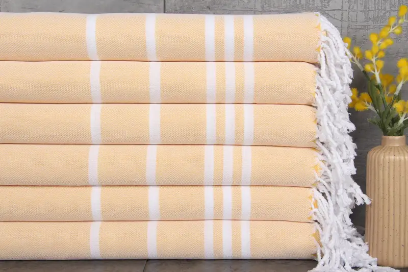 Turkish towels are characterized by their composition of 100% organic Turkish cotton, naturally dyed, ensuring durability and superior absorbency. Weighing 440 grams and measuring 40x71 inches or 100x180 centimeters, these towels are pre-shrunk and can be hand-woven with a tolerance of 1-2.5 centimeters. Each wash enhances their water absorption, ensuring longevity and softness.
