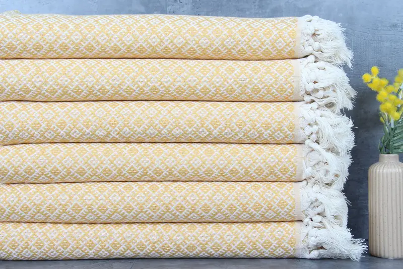 Organic Turkish towels are characterized by their 100% organic Turkish cotton construction, ensuring natural dyeing and high absorbency. These towels are woven to precise dimensions of 40x71 inches or 100x180 centimeters, with a weight of 450 grams per piece, allowing for a tolerance of 1-2.5cm in size. Each towel, hand-woven with care, results in a product that is pre-shrunk and ready for immediate use.