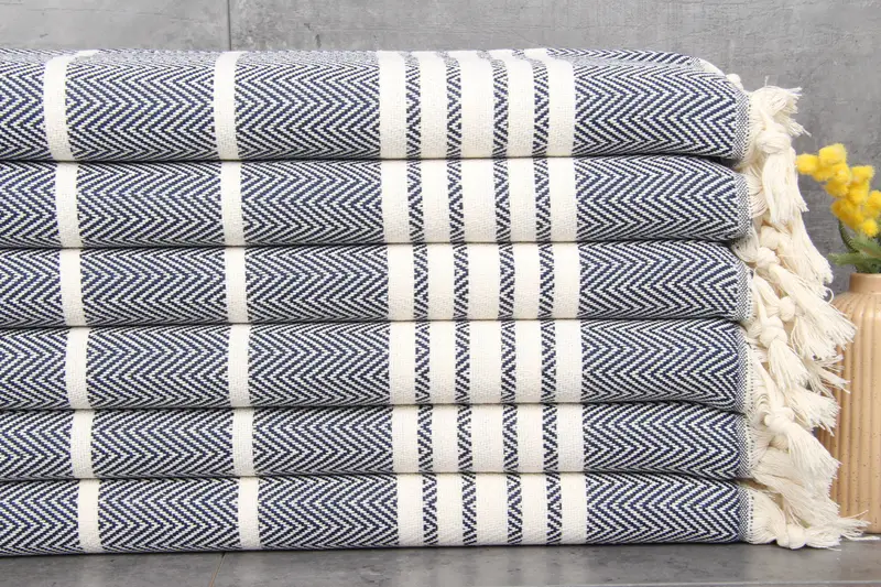 Turkish towels are manufactured from 100% organic Turkish cotton with natural dyes, ensuring a high-quality, eco-friendly fiber composition. Characterized by superior absorbency, these towels weigh 110 grams and are available in dimensions of 20x40 inches or 50x100 centimeters. Hand-woven with attention to detail, they exhibit tolerances of 1-2.5 cm.