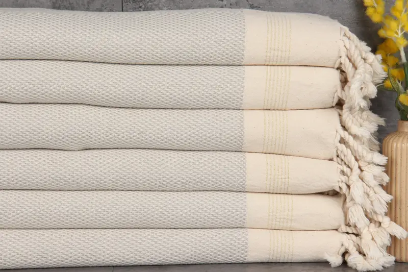 The Turkish Towels are characterized by their 100% organic Turkish cotton composition, ensuring natural dyes and superior absorbency, resulting in highly functional and durable textiles. Each towel maintains a specific weight of 360 grams and displays dimensions of 40x67 inches (100x170 centimeters), with hand-weaving tolerances of 1-2.5 centimeters. Customization services include embroidery and personalization, with pre-shrunk towels available for immediate use.