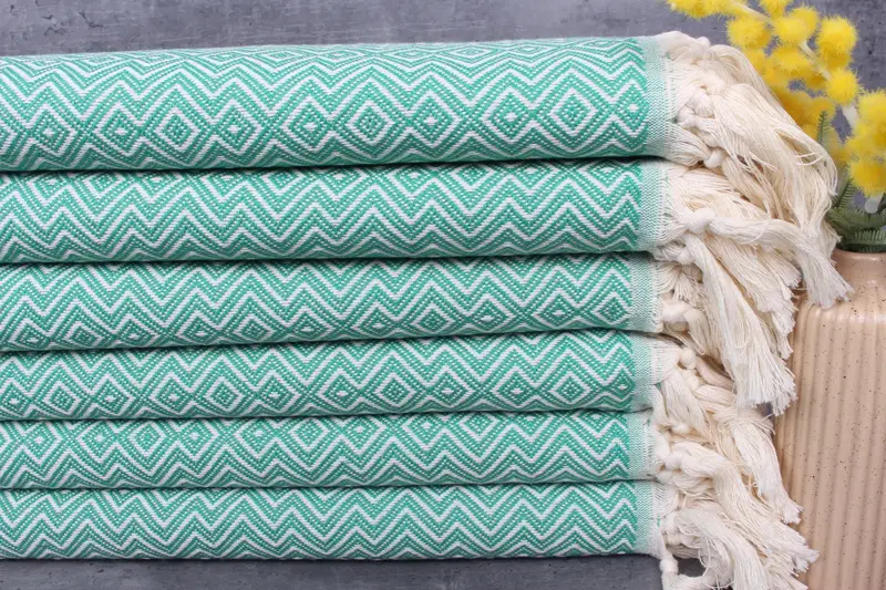 The Turkish towels, blankets, and hand towels are characterized by their fiber composition of 100% organic Turkish cotton. Ensuring superior absorbency, these items are natural dyed and pre-washed separately before shipment to preserve their quality. Measuring 38x71 inches (95x180 centimeters) and weighing 300 grams, they are hand-woven with a tolerance of 1-2.5 centimeters. Each piece is meticulously crafted with attention to detail.