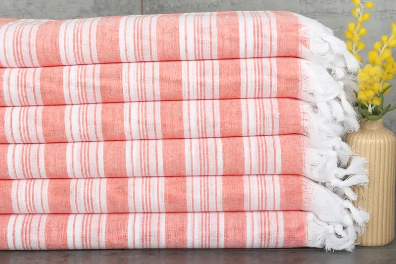 Turkish towels, blankets, and hand towels are characterized by their 100% organic Turkish cotton fiber composition, ensuring enhanced absorbency. The towels and blankets are produced with high-quality organic cotton, weighing 200 grams, and their dimensions are precisely 40x71 inches or 100x180 centimeters. Hand-weaving introduces tolerances of 1-2.5cm.