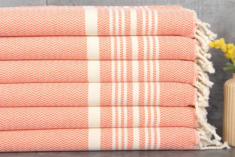 Turkish towels are characterized by their organic cotton fiber composition, consisting of 100% organic Turkish cotton, ensuring hypoallergenic properties and enhanced absorbency. Resulting in a weight of 112 grams and dimensions of 18x40 inches or 45x100 centimeters, these towels are hand-woven, allowing for tolerances of 1-2.5 centimeters in size.
