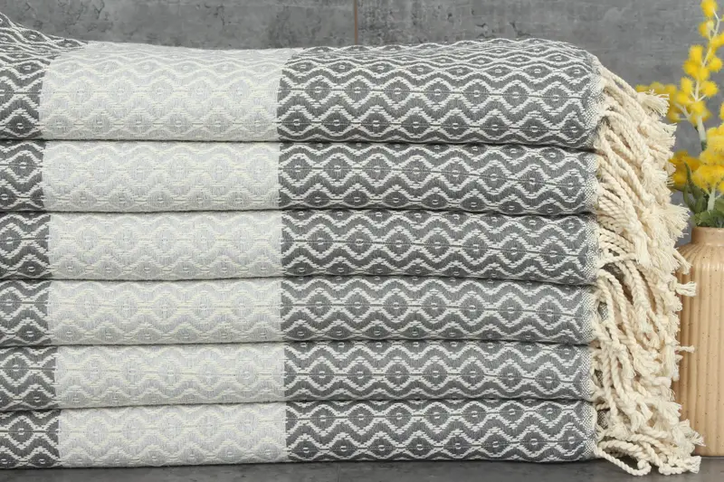 Characterized by their superior absorbency, the towels are crafted from 100% organic Turkish cotton, ensuring both durability and softness. Resulting in a product that is both lightweight and highly absorbent, these towels measure 40x71 inches or 100x180 centimeters, with a weight of 440 grams. Each item is meticulously hand-woven, allowing for minor variations of 1-2.5cm in dimensions.