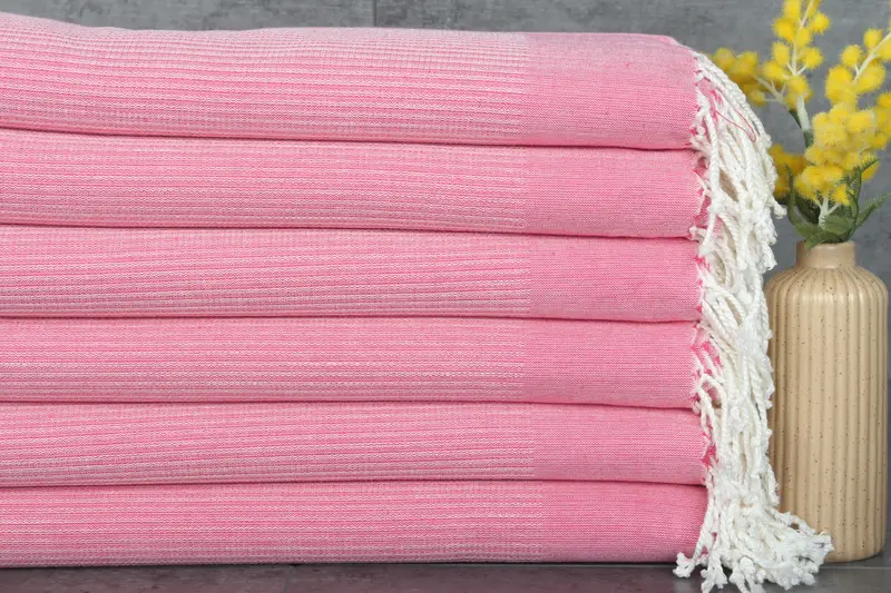 Turkish towels are characterized by their fiber composition of 100% organic Turkish cotton, ensuring high absorbency and natural dye coloring. These towels measure 38x71 inches or 95x180 centimeters and weigh 320 grams, with hand-weaving tolerances of 1-2.5 centimeters. Production is meticulously managed with looms, capable of handling orders from 500 to 1,000 pieces or more, depending on design and size.