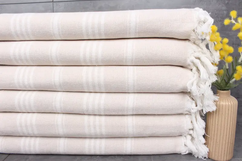 The towels are characterized by their 100% organic Turkish cotton composition, ensuring high absorbency and durability. The fiber density, resulting in a weight of 430 grams, enables effective moisture absorption that improves with each wash. Measuring 40x71 inches or 100x180 centimeters, these towels exhibit a hand-weaving tolerance of 1-2.5cm.