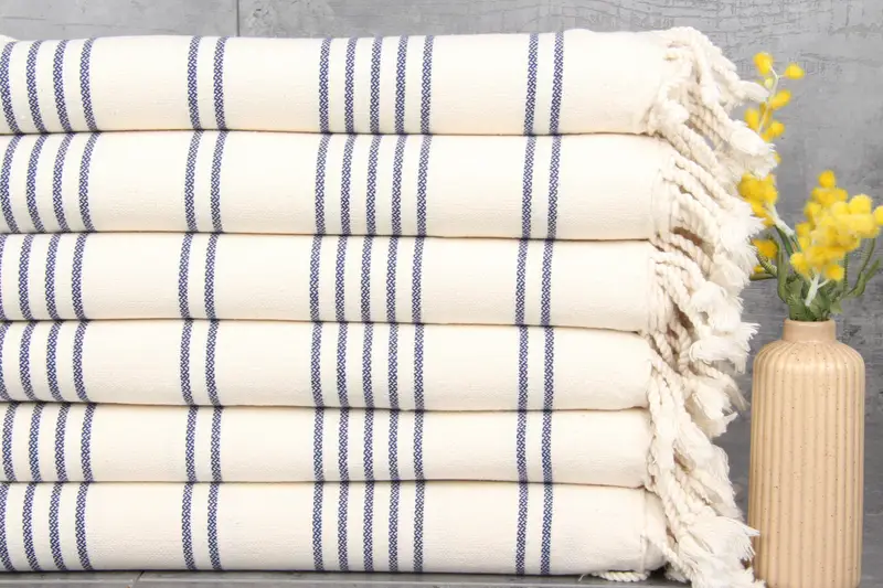 The Turkish Towels are characterized by their 100% organic Turkish cotton composition, providing a naturally soft texture. Ensuring high absorbency, these towels are crafted through a natural dyeing process, which enhances their aesthetic appeal. Weighing 340 grams and measuring 40x71 inches (100x180 centimeters), they feature hand-woven tolerances of 1-2.5 cm.