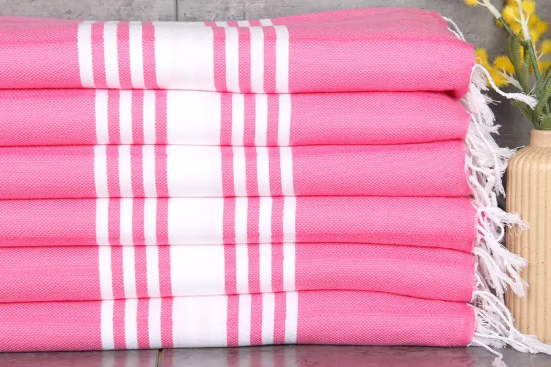 The Turkish Beach Towel is composed of 100% organic Turkish cotton, characterized by its high absorbency and softness. This material results in a product that is both durable and gentle on the skin. The dimensions of the towel are 40x71 inches or 100x180 centimeters, with a weight of 380 grams, ensuring it is robust yet lightweight. Hand-woven with precision, the product features tolerances of 1-2.5 cm.