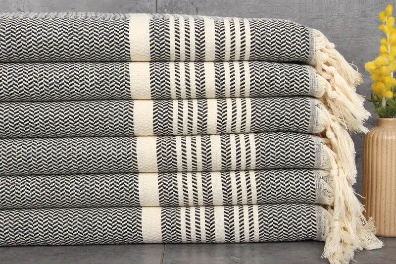 Turkish Towels and Blankets are composed of 100% Organic Turkish Cotton, ensuring a natural and soft texture. These products, characterized by their 18x40 inches (45x100 centimeters) dimension and 112 grams weight, exhibit high absorbency and durability. Hand-woven with precision, the towels allow for slight dimensional variances of 1-2.5 centimeters.