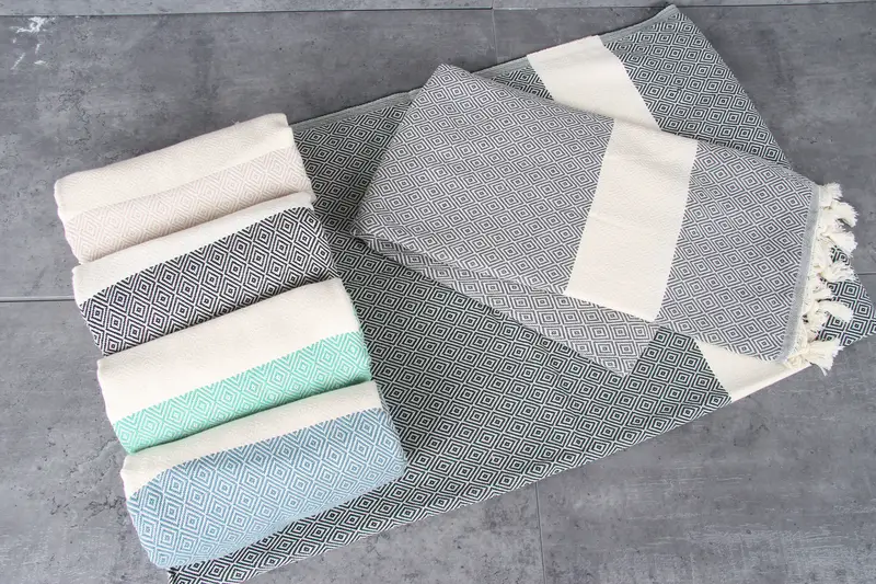 Turkish towels are characterized by their %100 organic Turkish cotton composition, ensuring high absorbency and durability. Towels are made from natural-dyed cotton, with GSM of 220 grams/sq. meters, available in sizes 40x70 inches/100x180 centimeters and 20x36 inches/50x90 centimeters. Hand-weaving tolerances may vary by 1-2.5 cm.