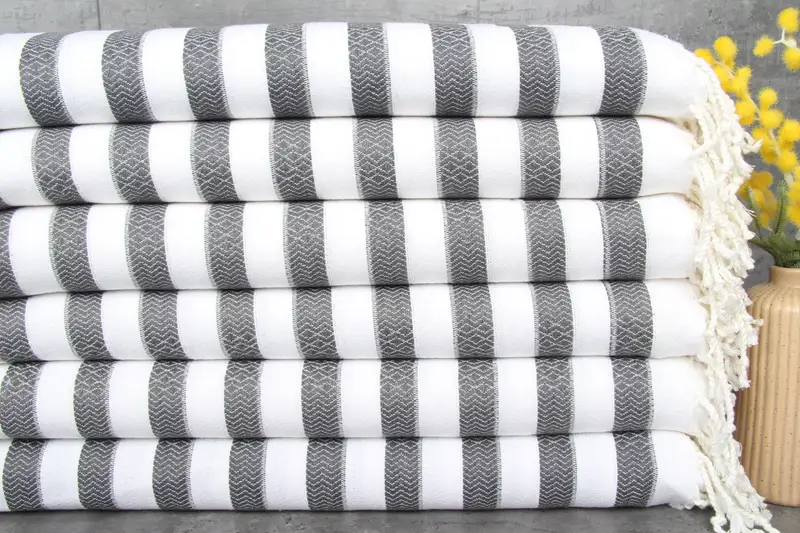 Organic Turkish cotton characterizes these towels, ensuring superior absorbency and durability. The towels measure 36x71 inches or 90x180 centimeters and weigh 340 grams. Tolerances in hand-weaving permit variations of up to 1-2.5cm.