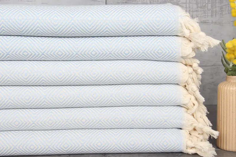 Turkish towels are characterized by their %100 organic Turkish cotton construction, ensuring high absorbency and softness. Each towel or blanket, weighing 120 grams, measures precisely 20x36 inches or 50x90 centimeters, with hand-weaving tolerances of 1-2.5cm. This meticulous process guarantees the longevity and texture of the towels.