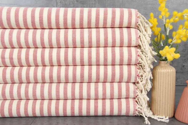 Characterized by %100 organic Turkish cotton, these towels are natural dyed ensuring durability and softness. Weighing at 220 grams per square meter (GSM) and sized at 40x70 inches/100x180 centimeters, each piece is hand-woven with tolerances of 1-2.5 cm. Their GSM is meticulously maintained through repeated washes, resulting in increased absorbency.