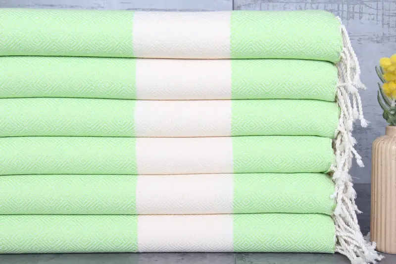 Comprising 100% organic Turkish cotton, the towels and blankets ensure high absorbency and durability. Characterized by natural dyeing, the materials enhance color retention after each wash, resulting in brighter hues over time. Weighing 115 grams, the hand towels and blankets adhere to a consistent weight standard, allowing for hand-weaving tolerances within 1-2.5 cm.
