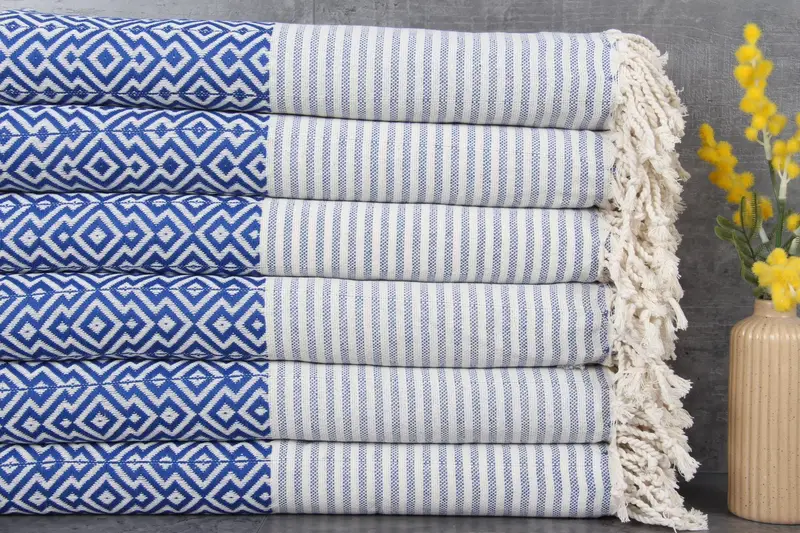 Turkish towels are characterized by their 100% organic Turkish cotton composition, ensuring maximum absorbency and softness. Each towel, blanket, or throw is meticulously hand-woven, resulting in a 38x75 inches (95x190 centimeters) piece that weighs 400 grams, with a tolerance of 1-2.5cm. For optimal care, separate washing during the first 2-3 washes is recommended, followed by machine washing at 30-40°C.