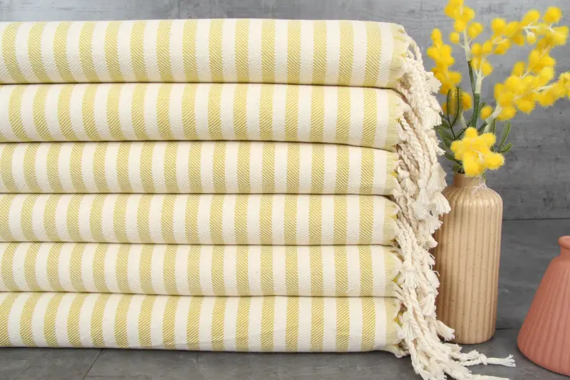 Organic Turkish cotton ensures superior absorbency, making it ideal for various household applications. Characterized by a GSM of 220 grams/sq. meters, these towels maintain structural integrity, with hand-weaving tolerances of 1-2.5cm. Dimensions for towels and throws are 40x70 inches/100x180 centimeters, allowing for versatile use.