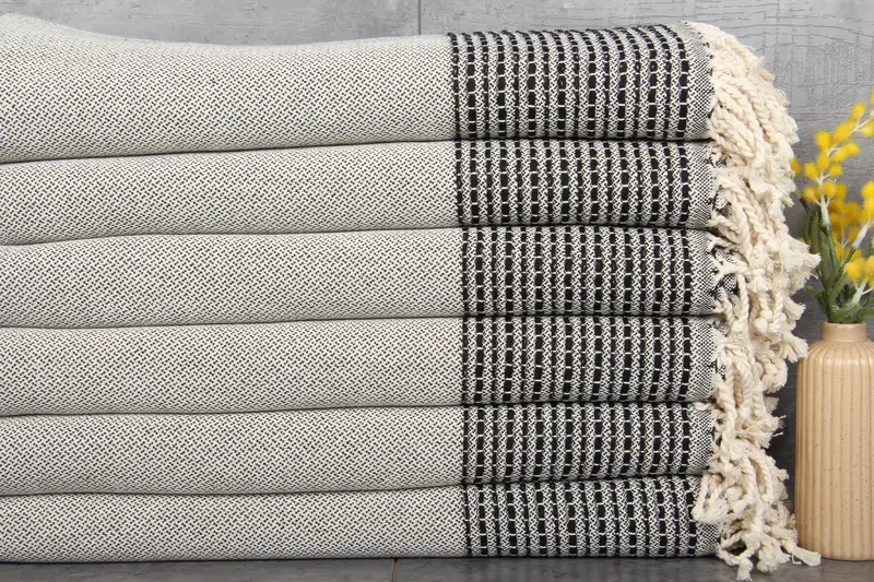 The product is characterized by its high-quality fiber composition, ensuring superior absorbency and durability. Made from 100% organic Turkish cotton, each towel weighs 420 grams and measures 36x69 inches or 90x175 centimeters. Each piece is hand-woven, with tolerances of 1-2.5 cm, resulting in a refined finish.