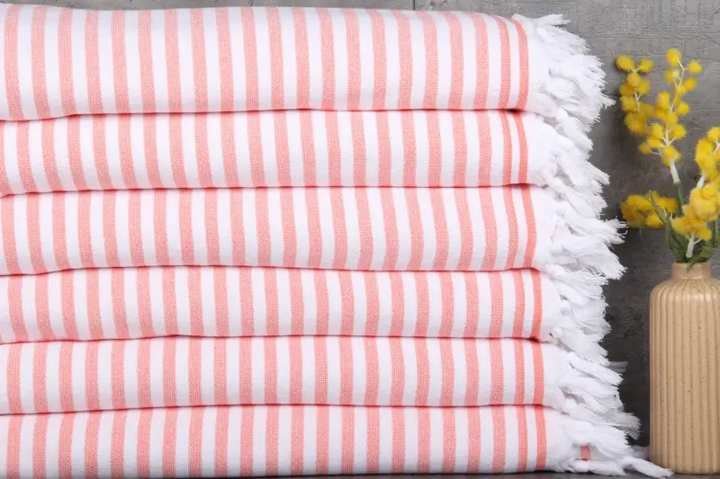 Characterized by 100% organic Turkish cotton, these towels ensure high absorbency, enhancing usability across various settings. The fibers, naturally dyed, result in towels measuring 36x71 inches or 90x180 centimeters, with a weight of 400 grams. Hand-weaving tolerances permit variations up to 1-2.5 cm in dimensions.