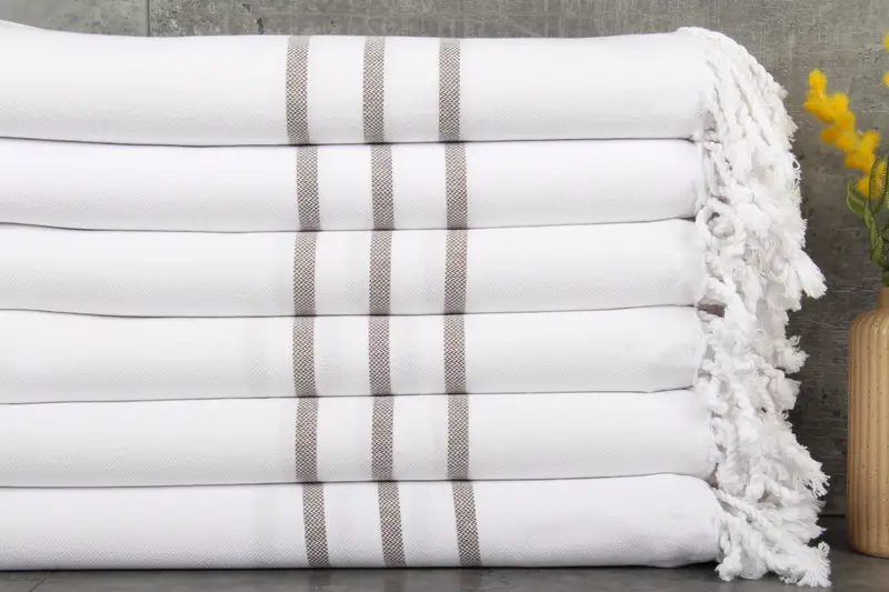Turkish towels are characterized by their %100 organic Turkish cotton composition, ensuring natural and breathable texture. Each towel weighs 420 grams and measures 40x71 inches or 100x180 centimeters, providing a balanced size for various applications. Tolerances in hand-weaving may range from 1 to 2.5 centimeters.