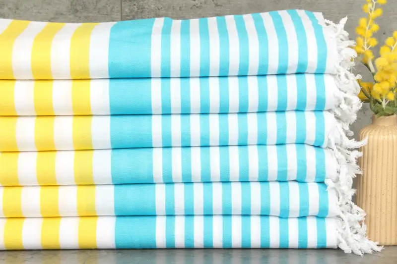 Turkish towels are characterized by their %100 organic cotton construction, ensuring natural fiber composition. These towels exhibit robust absorbency, with cotton fibers becoming increasingly absorbent with each wash. Each towel measures 36x67 inches or 90x170 centimeters, weighs 260 grams, and has hand-weaving tolerances of 1-2.5cm.