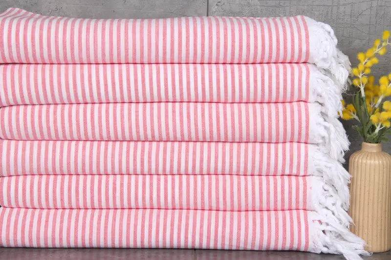 These beach towels are crafted from 100% organic Turkish cotton, ensuring high absorbency and comfort. Characterized by their soft texture and durability, the towels have a weight of 200 grams and measure 36x67 inches (90x170 centimeters). The natural dyeing process results in a 2-3cm tolerance in hand-weaving.