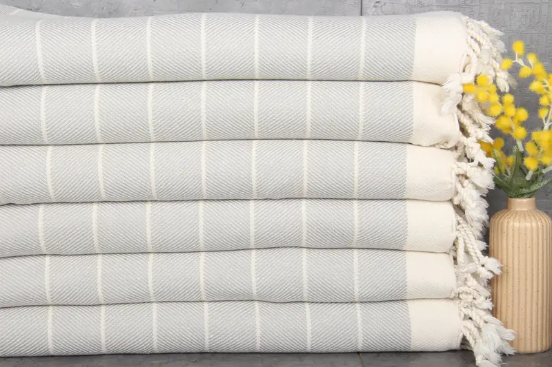 The Turkish towels and blankets are crafted from 100% organic Turkish cotton, ensuring a soft and absorbent texture. These towels exhibit a weight of 360 grams per square meter, offering durability while maintaining flexibility. The organic cotton fibers absorb water more effectively with each wash, resulting in enhanced absorbency over time.