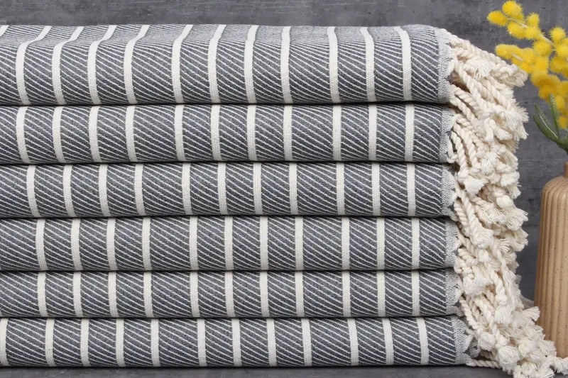 Constructed from 100% organic Turkish cotton, these towels are characterized by their natural dyeing process, ensuring a soft and skin-friendly texture. Each towel measures 40x71 inches (100x180 centimeters), weighs 360 grams, and tolerates slight variations in hand-weaving up to 2.5 cm. Hand-weaving results in unique patterns and increased absorbency with each wash.