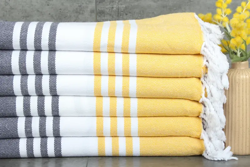 The Turkish towels are made from 100% organic Turkish cotton, ensuring high absorbency and softness. These towels measure 36x71 inches (90x180 centimeters) and weigh 340 grams, with slight variations in hand-weaving up to 2.5 cm. Customization options include embroidery, with an additional two days needed for personalized orders. Free shipping is available for orders over 35 USD, with estimated delivery times varying by region. The towels are pre-shrunk and can be washed separately for the first 2-3 washes to maintain their longevity and absorb...