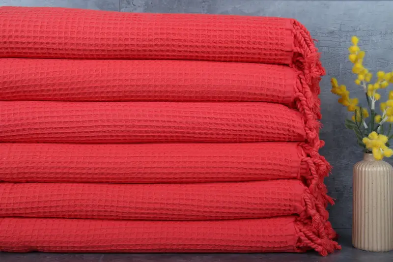 The Turkish towels and blankets are characterized by their %100 organic Turkish cotton, ensuring high absorbency and durability. Weighing 300 grams, the towels measure 36x67 inches or 90x170 centimeters, with hand-weaving tolerances of 1-2.5cm. Production is capable of meeting bulk orders, with customization options available for specific designs and sizes.